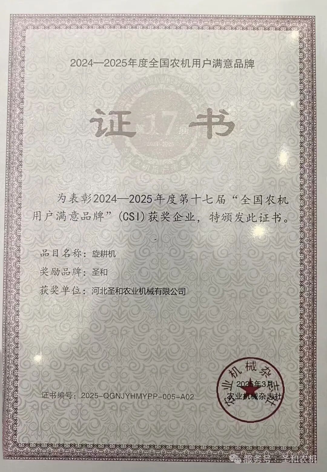 3 月至 5 月,圣和品牌迎來榮譽 “雙豐收”!3 月 7 日,“圣和牌旋耕機” 在全國農機品牌大會上連續多年斬獲 “全國農機用戶滿意品牌”,用千萬農戶的口碑印證產品硬實力;5 月 10 日中國品牌日當天,圣和公司再添重磅榮譽,榮膺河北省 “行業領航品牌” 稱號!雙榮譽加身,不僅是對圣和深耕農機領域多年的極致認可,更彰顯了其引領行業發展、踐行品牌強國戰略的絕對實力,未來品牌影響力將持續輻射全國、走向世界!